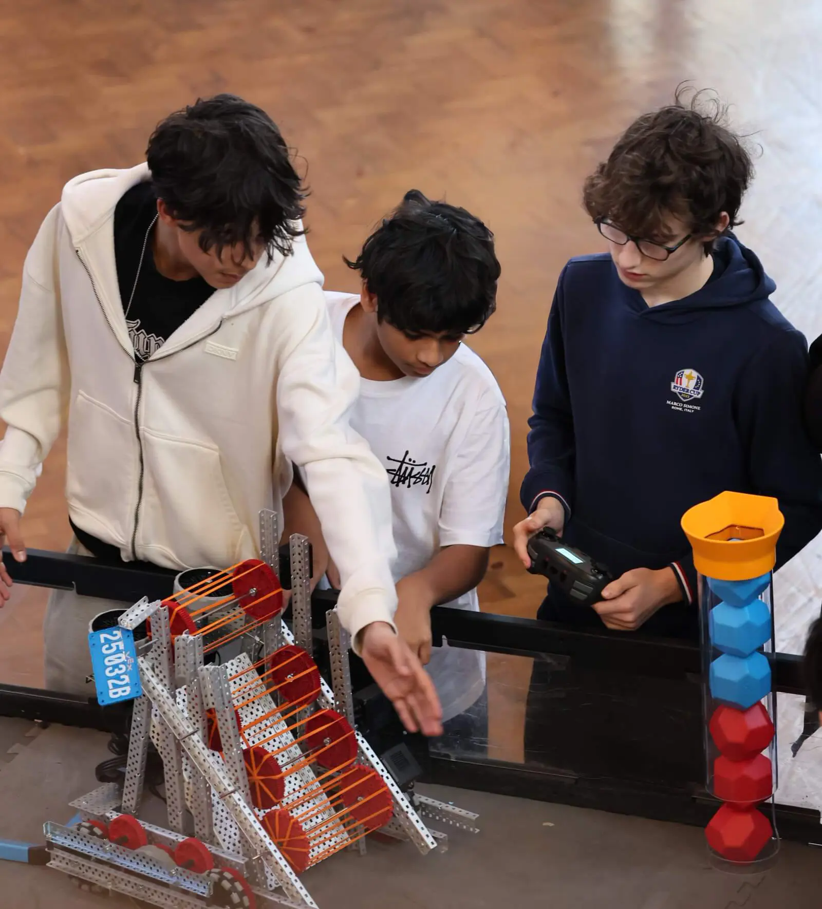 Two of these teams built their robots during their A Level Design Engineering lessons in First Year Specialists (Year 12), while the third team – Leo, Max, and Kin, all current Fifth Form (Year 11) pupils – developed their winning robot in our Wednesday after-school robotics club (4.00–5.30pm). With support from Cranleigh School, their hard work geared them up for success, and they drove away with the overall win.