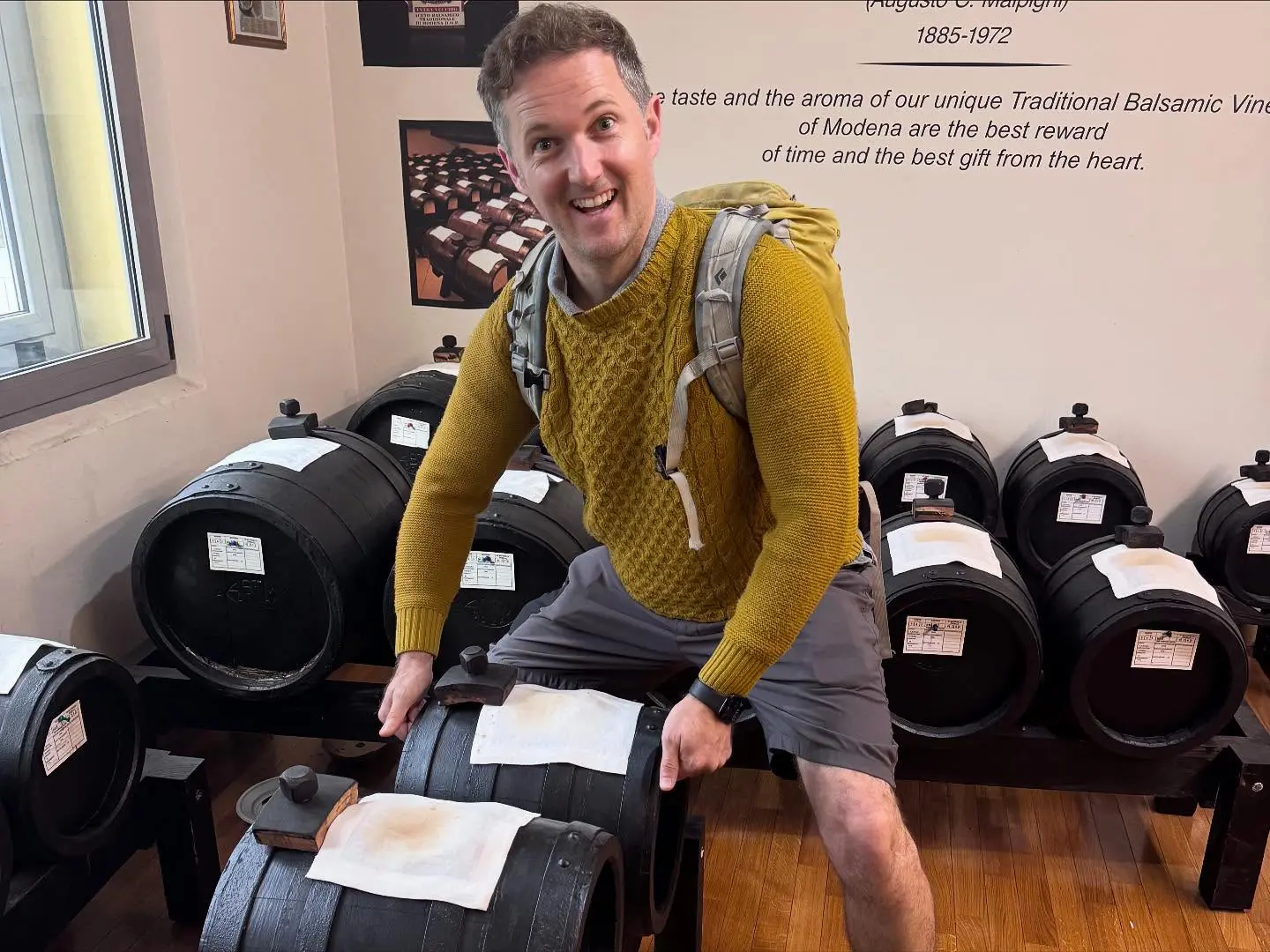They then stepped into the world of traditional balsamic vinegar. The Latin word balsamum means “balsam-like,” referring to something soothing or healing, which felt entirely fitting for such an immersive experience. There was even an attempt to see whether one of the barrels could fit into a hand luggage allowance.
